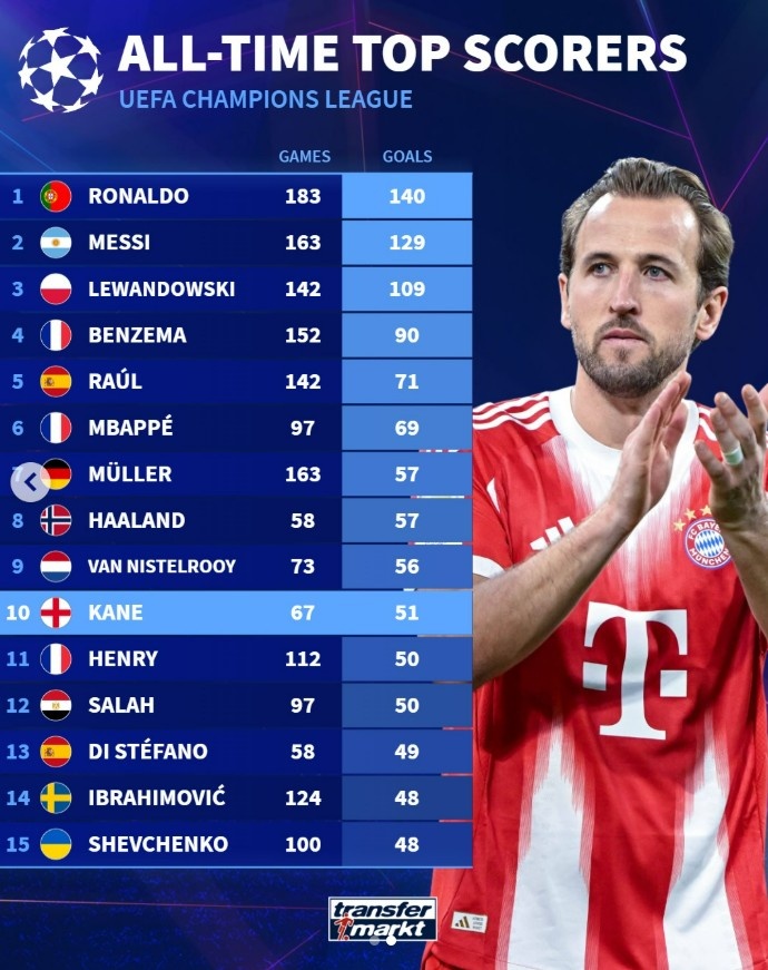 欧冠历史射手榜: